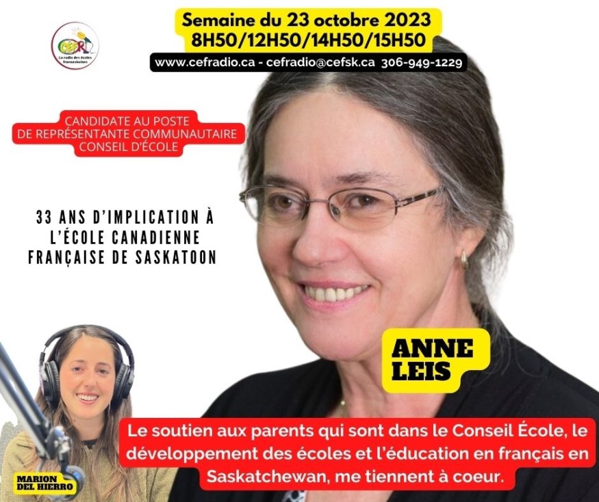 Anne Leis, candidate au poste de Représentante communautaire au Conseil d'école de l'École Canadienne Française de Saskatoon, a plus de 33 ans d'implication dans la communauté. Faisant la liaison entre le conseil d'école et la fédération francophone de Saskatoon, elle veut apporter une lumière sur l'identité, la langue et la culture francophone. Elle est toujours aussi déterminée à mobiliser les francophones de Saskatoon pour soutenir leurs efforts. Pour elle, il est important de soutenir les parents qui sont dans le Conseil d'école et de developper les écoles et l'éducation en français en saskatchewan.