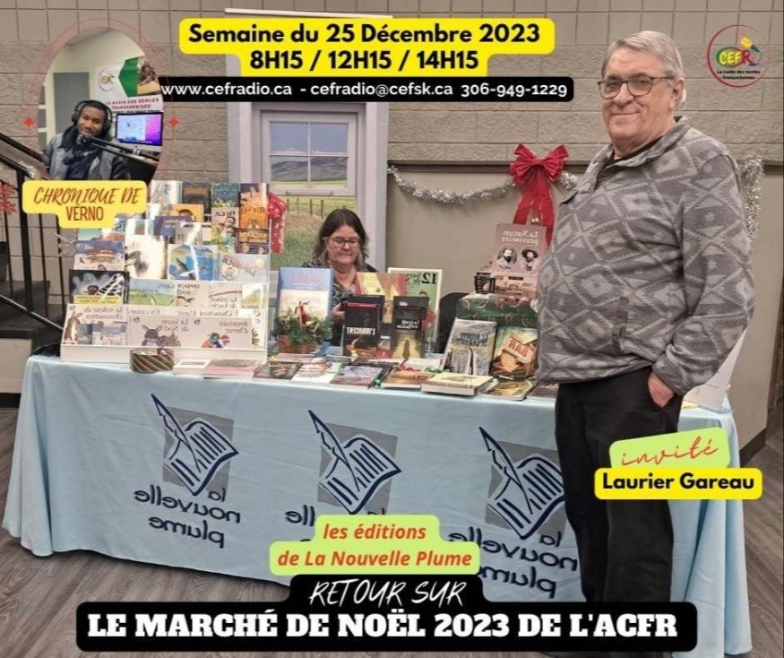 Un marché de noël a été organisé par l'ACFR en date du 15 et du 16 décembre 2023 à Regina. Les différents artisans et commerçants fransaskois ont été invités à y présenter leurs produits. À cette occasion, les éditions de La Nouvelle Plume ont présenté une collection diversifiée de leurs ouvrages dont la collection Petits copains pour les tout petits, la collection Escapade pour les jeunes de 12 à 16 ans, des pièces de théâtre, des récits, des nouvelles, des romans et une section du patrimoine fransaskois. À cette liste s'ajoutent des nouveautés dont la nouvelle pièce de théâtre de Laurier Gareau '' La nation provisoire ''. Au cours d'une belle entrevue Laurier Gareau, président de la Nouvelle Plume, revient sur leur exposition au marché de noël de l'ACFR et nous parle de son nouveau livre, qui est inspiré par son histoire familiale.